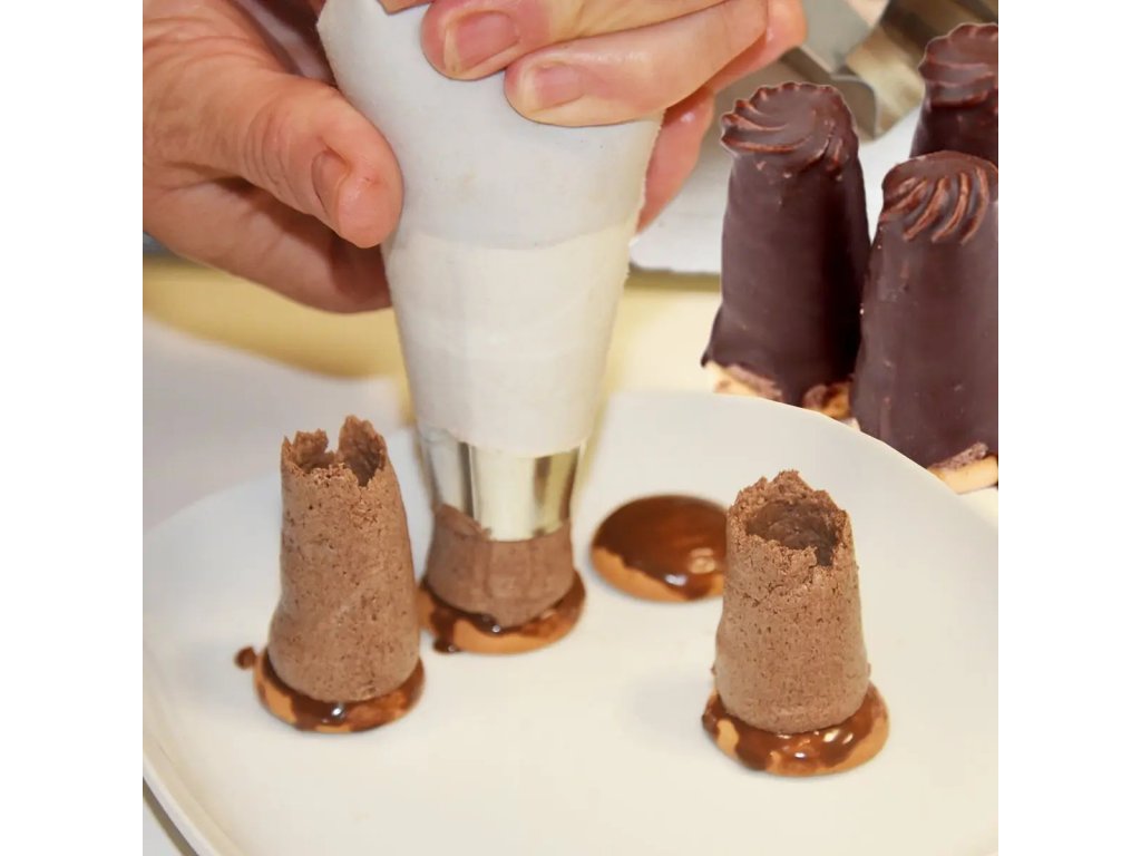 Pomocí této speciální dvoustěnné špičky můžete vytvořit tento oblíbený zákusek, stačí do sáčku vložit špičku, krém a na připravený cukrářský piškot tahem vzhůru nanést. Vzniklý otvor se pak plní vaječným likérem, uzavře krémem a máčí se v čokoládě.